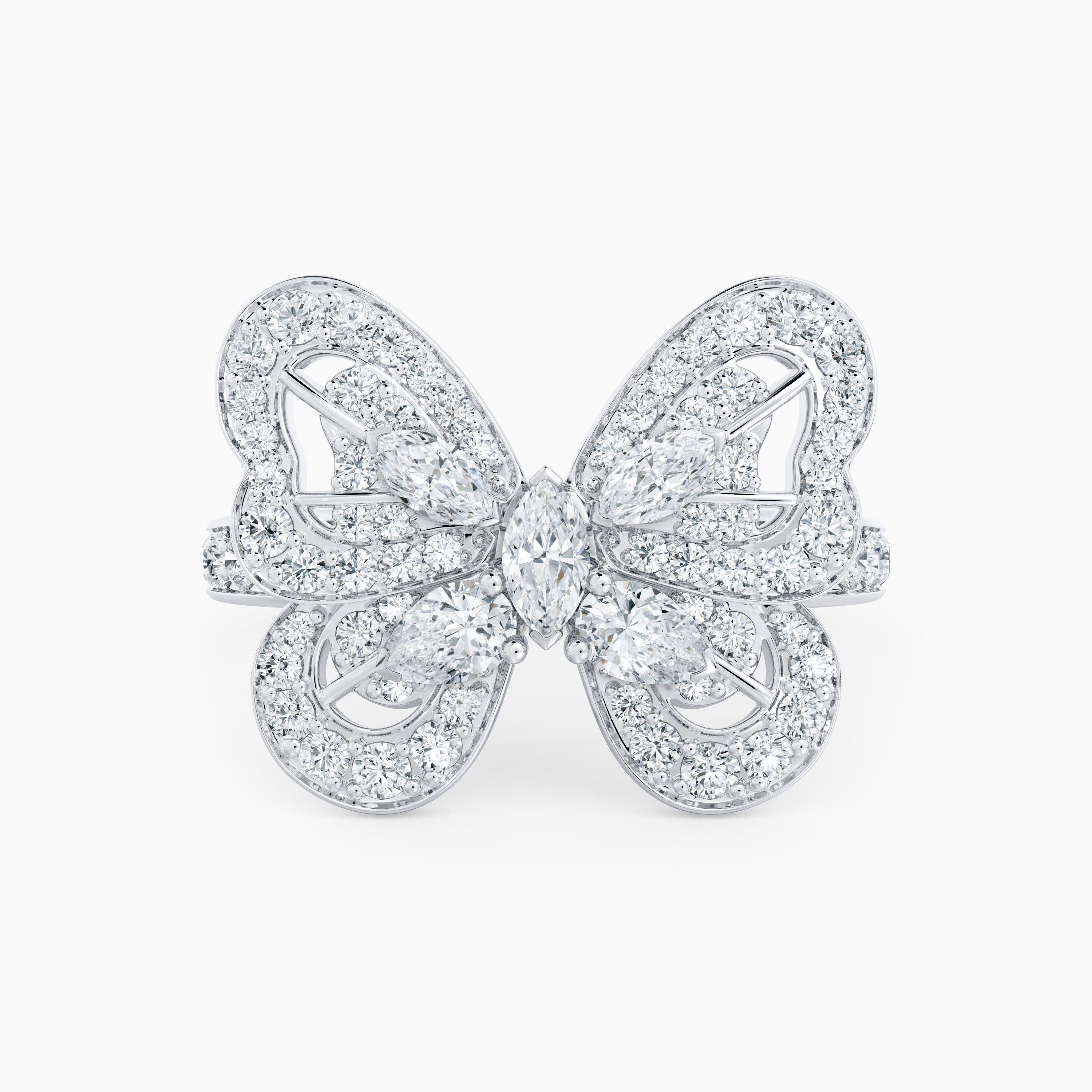 Cette bague s'inspire de la nature transformatrice du papillon et de la façon dont la lumière se reflète sur ses ailes irisées. D'un poids total d'environ 0,89 carat et sertie en or blanc 18 carats, la beauté des ailes du papillon est rehaussée par l'éclat naturel de chaque diamant de tailles marquise, poire et brillant.