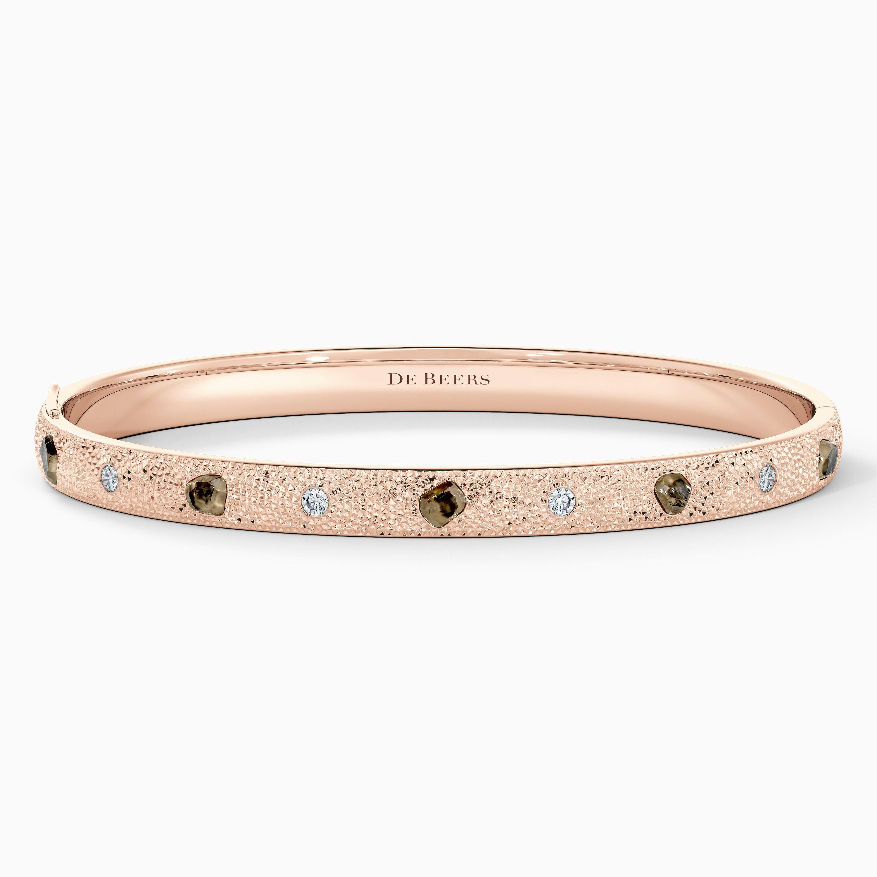 Ce bracelet associe des diamants bruts à des diamants polis de tailles rose et brillant, arrangement emblématique de De Beers. Les diamants sont encapsulés dans une monture en or rose 18 carats sublimée par notre serti poinçon, une technique de martelage a la main que nous utilisons dans la collection Talisman pour révéler davantage les diamants bruts que ne le permettent les méthodes de sertissage traditionnelles. Le poids total des diamants est d'environ 0,64 carat. Les diamants bruts ont un aspect organique unique grâce à leur surface naturelle. Lorsqu’ils furent découverts pour la première fois, il y a environ 2 000 ans, ils étaient considérés comme des talismans. C'est pourquoi nous les mettons aujourd’hui à l’honneur dans notre collection Talisman.